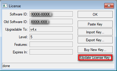 Aby se mi podařilo provést Upgrade z RouterOS tuším v3.15 na v6.41.2 (která byla v době upgradu aktuální), nebylo možné toto provést přímo (viz toto fórum). Nejdříve bylo nutné zavést verzi 3.30 (kdy došlo ke změně licenčního klíče z formátu XXXX-XXX na XXXX-XXXX). Po zavedení tohoto ROS bylo nutné provést update licenčního klíče (System/License/tlačítko "Update License Key"). Pozor, pokud by tento krok nebyl správně proveden, hrozí ztráta licence na RouterOS. Ztráta licence také zřejmě hrozí při formátování NAND paměti routeru, více k tomu je ZDE.